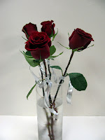 We gathered the red roses in and bound them with a silver ribbon. The roses we choose for Lonni's Bouquet are called "Forever Young". We love the rich burgundy color, and the large heads.